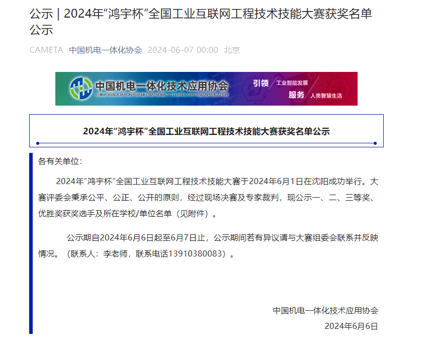 2024年“鸿宇杯”全国工业互联网工程技术技能大赛于2024年6月1日在沈阳成功举行。大赛评委会秉承公平、公正、公开的原则,经过现场决赛及专家裁判,现公示一、二、三等奖、优胜奖获奖选手及所在学校/单位名单(见附件)。