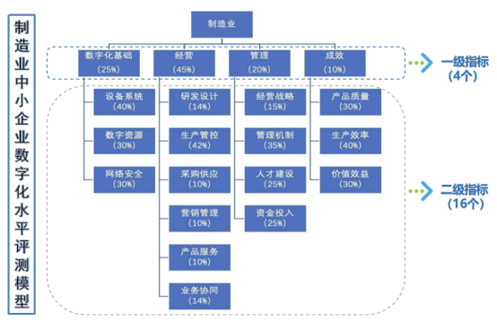 《评测指标》根据行业特点,分为制造业数字化水平评测表、生产性服务业数字化水平评测表、其他行业数字化水平评测表 三个类别,从数字化基础、经营、管理、成效 四个维度综合评估中小企业数字化发展水平,依据企业评测得分,将数字化水平划分为四个等级: