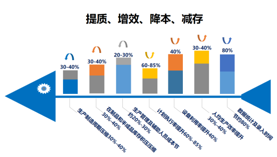 数字化转型后生产制造周期能够压缩30%-40%,人均生产效率提升30%-40%,生产管理及辅助人员成本节约20%-30%,制品和半成品库存积压压缩30%-40%。提质、增效、降本、减存,这八个字是鸿宇科技服务百余家企业完成数字化转型后综合数据总结而出的。