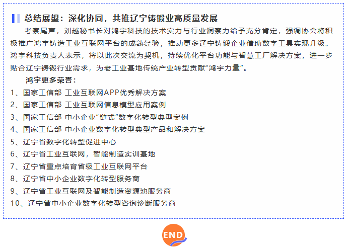 近日,辽宁省铸锻行业协会常务副会长兼秘书长刘越、副秘书长张玉波一行莅临沈阳鸿宇科技有限公司考察交流。双方围绕辽宁铸锻行业数字化转型痛点展开深度对话,领导一行还实地参观了鸿宇铸造工业互联网平台与模拟智慧工厂,直观感受数字技术为传统铸锻业注入的新动能。